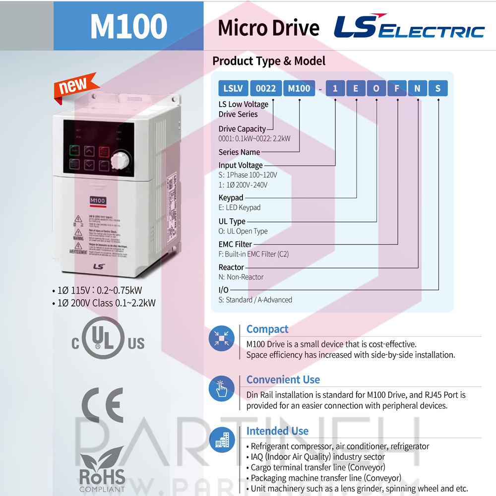 اینورتر تک فاز 0.75 کیلو وات سری M100 برند LS مدل LSLV0008M100-1EOFNA