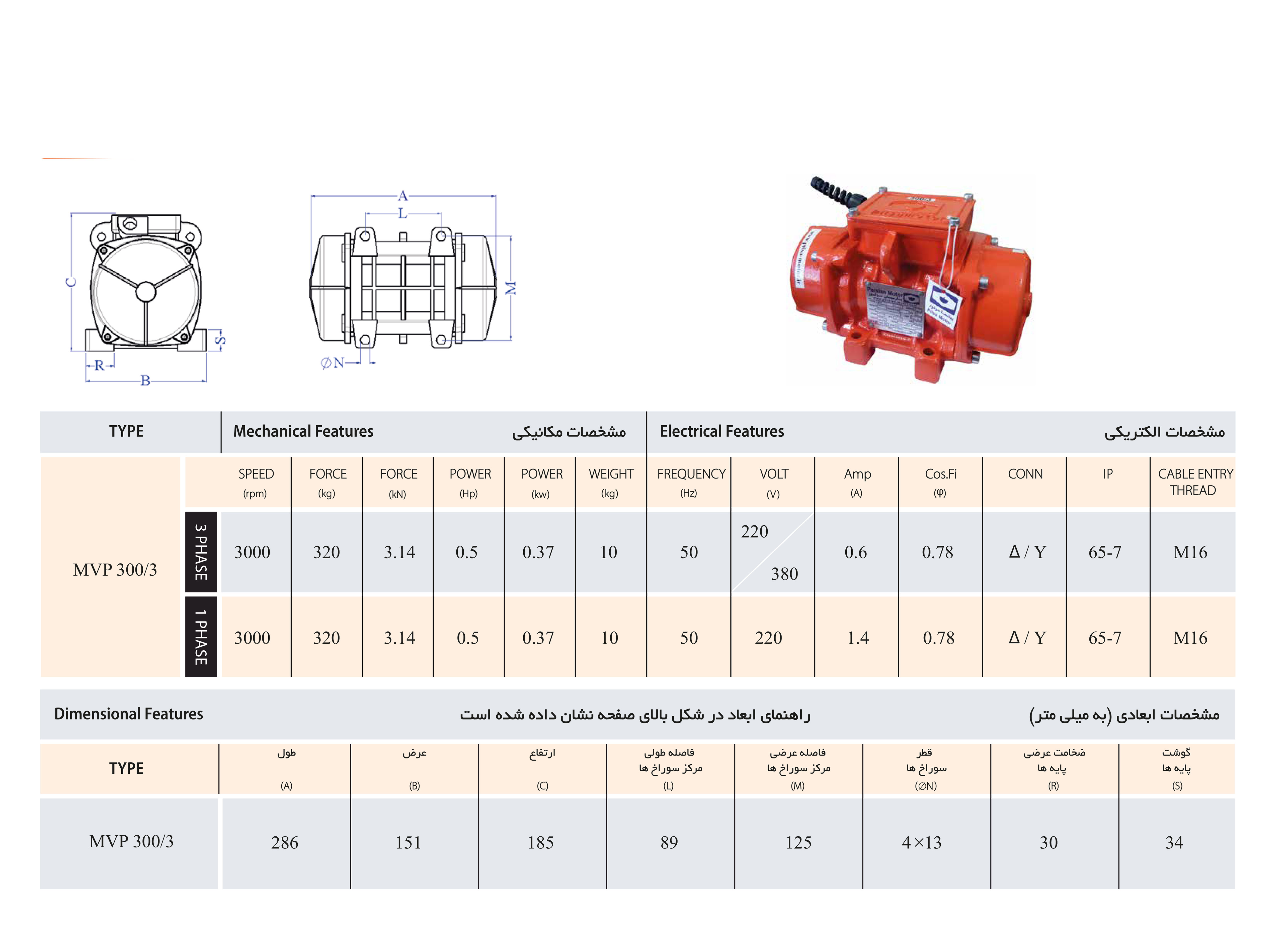 موتور ویبره بدنه تک فاز 300/3 MVP پیلسا (پارسیان) 300 کیلوگرم 3000 دور
