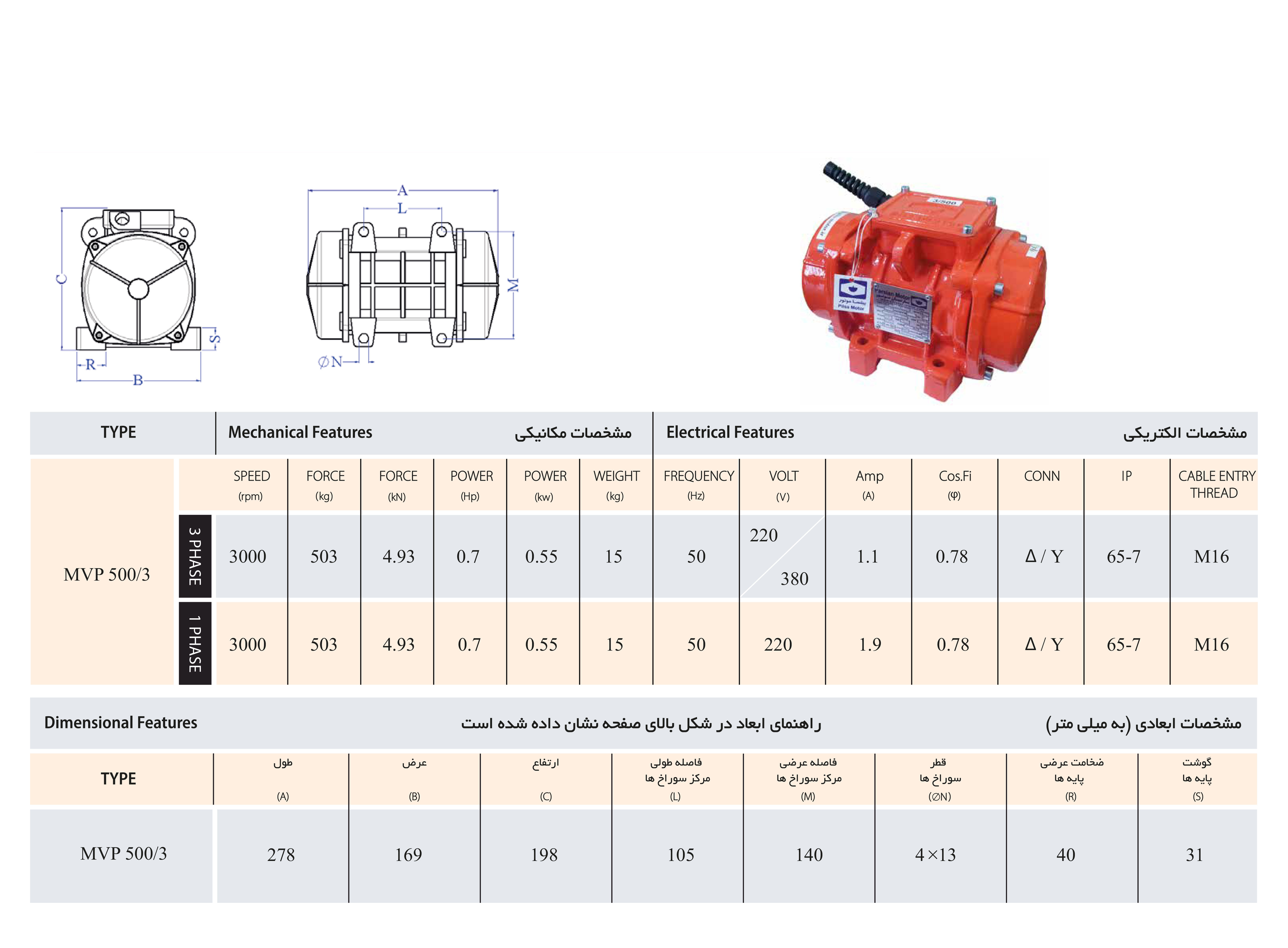 موتور ویبره بدنه تک فاز 500/3 MVPپیلسا (پارسیان) 500 کیلوگرم 3000 دور