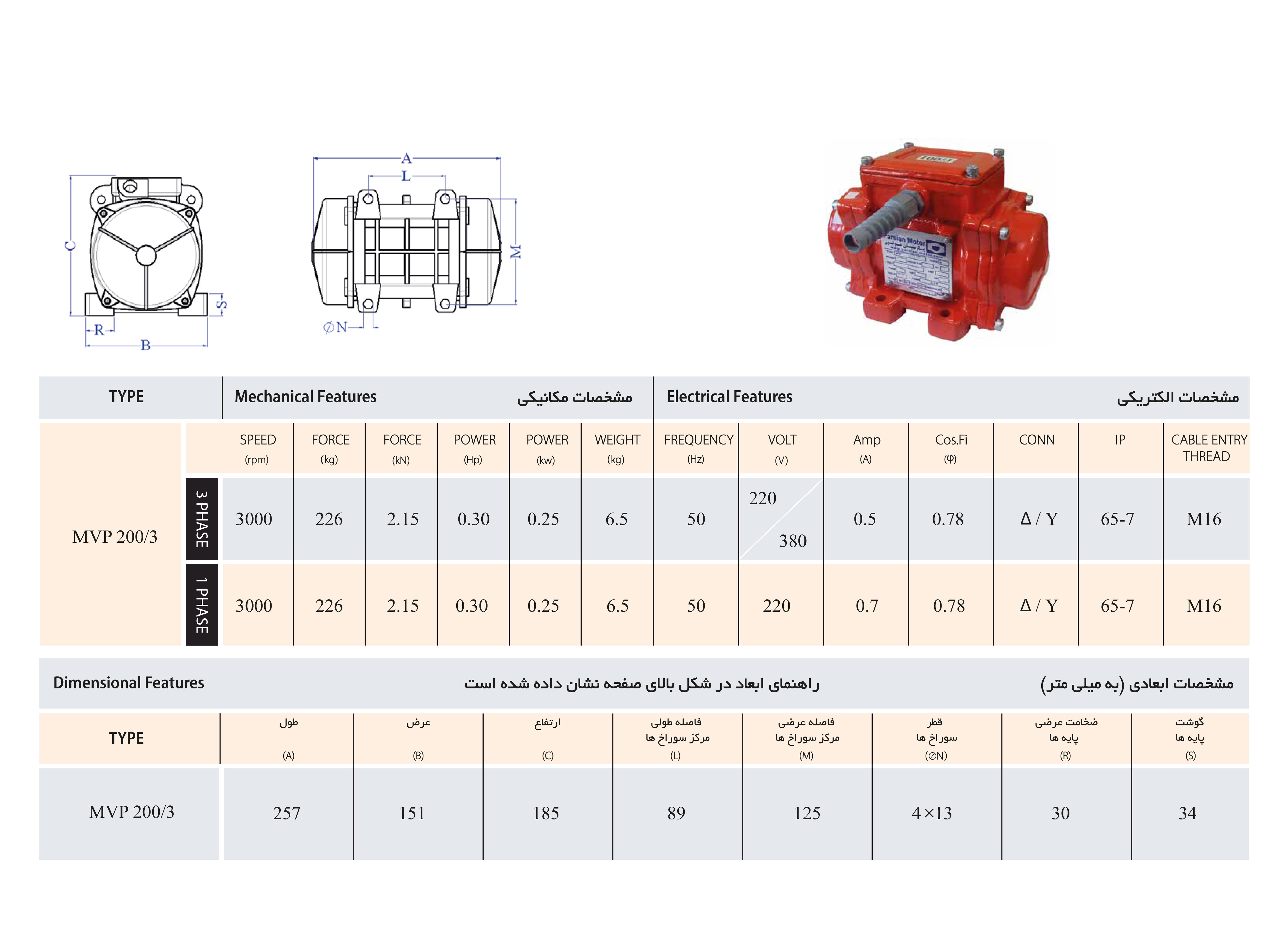 موتور ویبره بدنه سه فاز 200/3 MVP پیلسا (پارسیان) 200 کیلوگرم 3000 دور