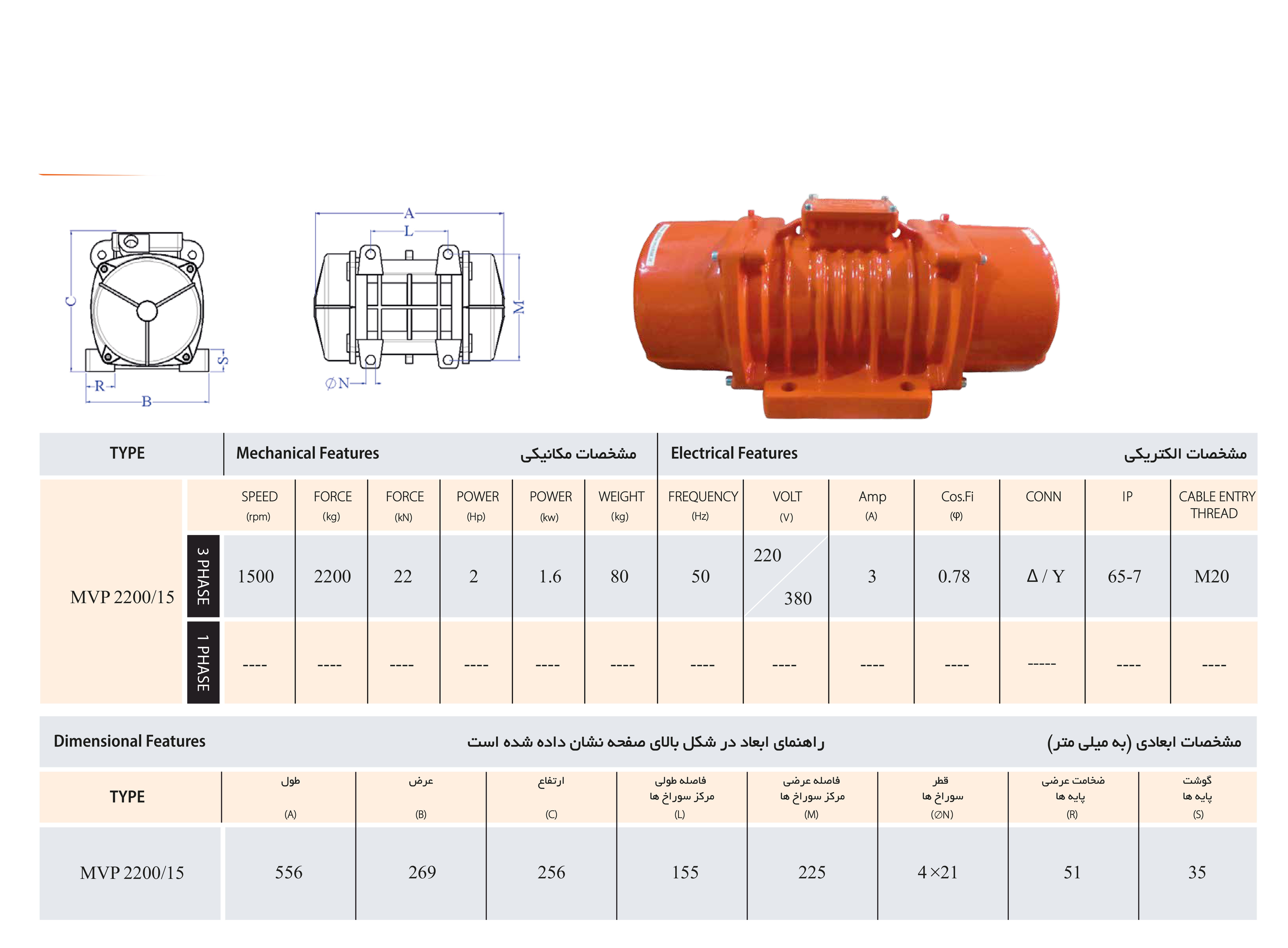 موتور ویبره بدنه سه فاز 2200/15 MVPپیلسا (پارسیان) 2200 کیلوگرم 1500 دور