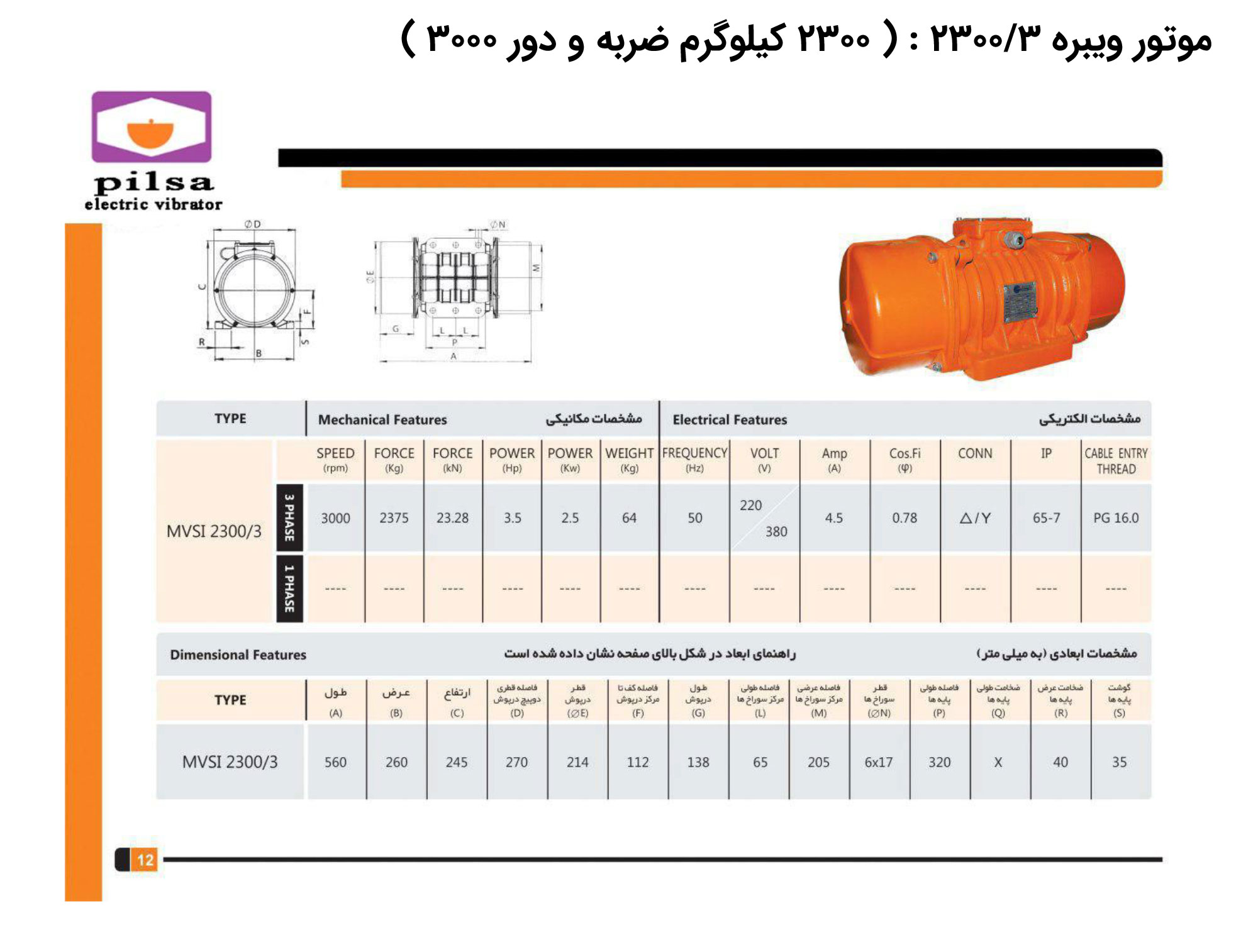 موتور ویبره بدنه سه فاز 2300/3 MVP پیلسا (پارسیان) 2300 کیلوگرم 3000 دور